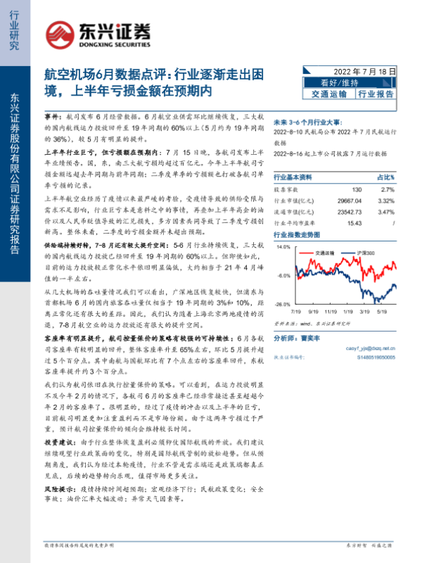 【东兴证券】【20220718】航空机场6月数据点评:行业逐渐走出困境,上半年亏损金额在预期内-9页 行业研究