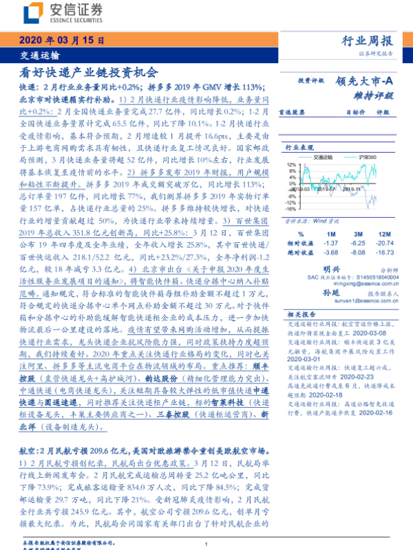 【安信证券】【20200315】交通运输行业周报:看好快递产业链投资机会-20页 行业研究
