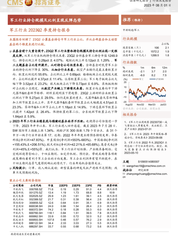 【海通证券】【20230801】军工行业2023Q2季度持仓报告:军工行业持仓规模及比例呈现反弹态势-14页 行业研究