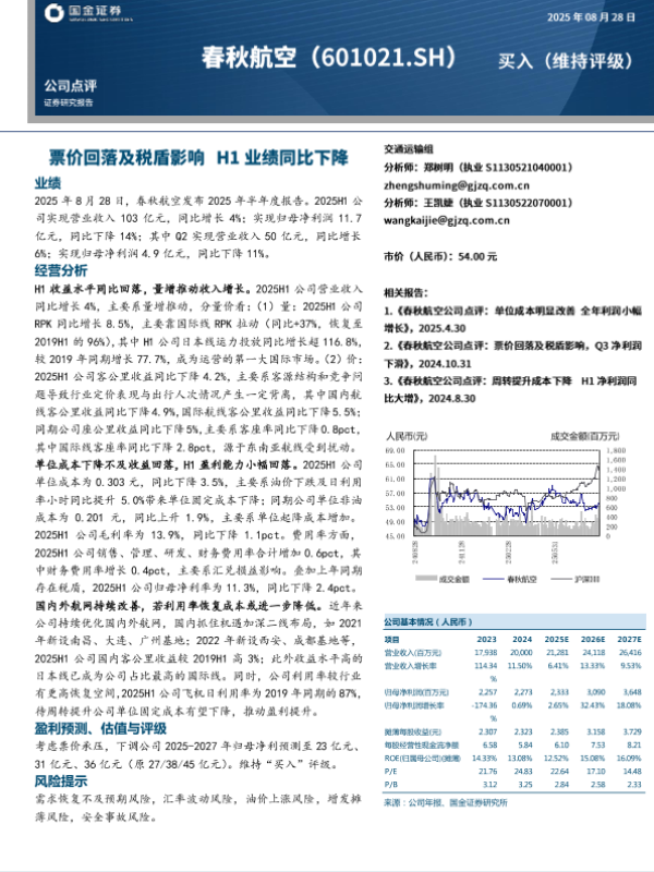 【东吴证券】【20250828】春秋航空-票价回落及税盾影响_H1业绩同比下降-4页 证券期货研究报告