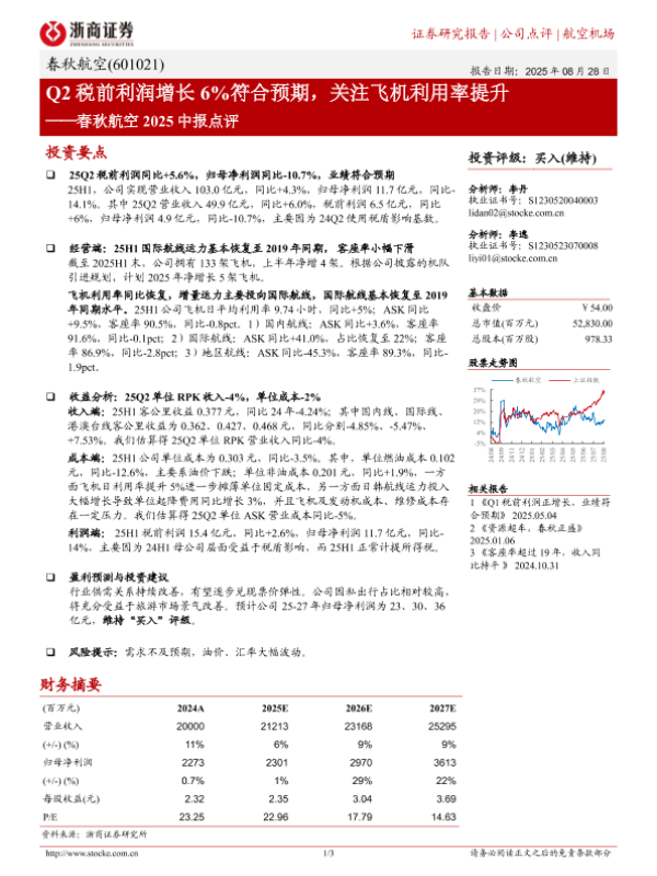 【浙商证券】【20250828】春秋航空-Q2税前利润增长6%符合预期,关注飞机利用率提升-3页 证券期货研究报告
