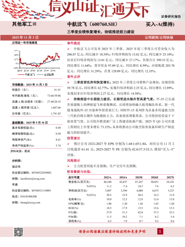 【山西证券】【202511】中航沈飞(600760.SH) 买入-A(维持) 三季度业绩恢复增长,持续推进能力建设-5页 证券期货研究报告