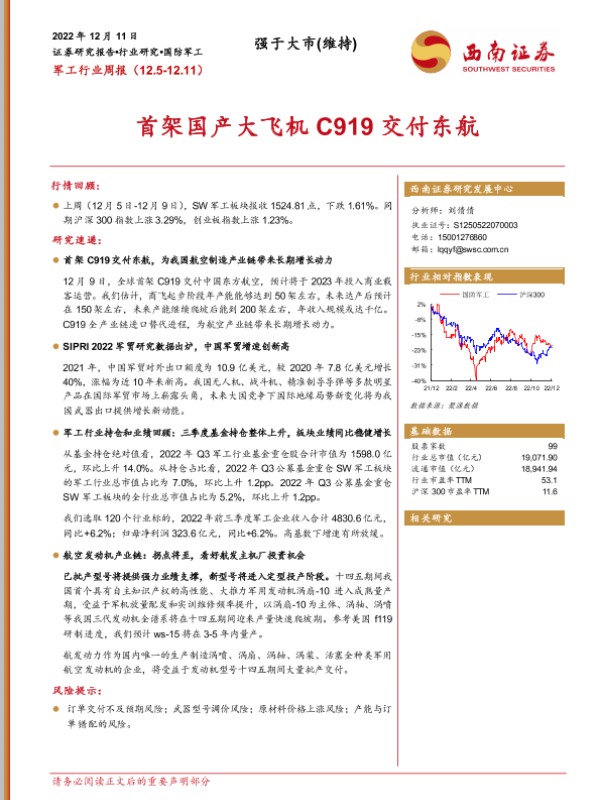 【西南证券】【20221211】20221211-西南证券-军工行业周报:首架国产大飞机C919交付东航-18页 行业研究