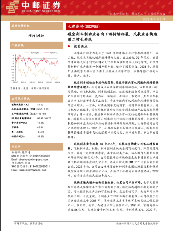 【中邮证券】【20230702】北摩高科(002985)航空刹车制动业务向下游持续拓展,民航业务构建第二增长曲线-28页 行业研究