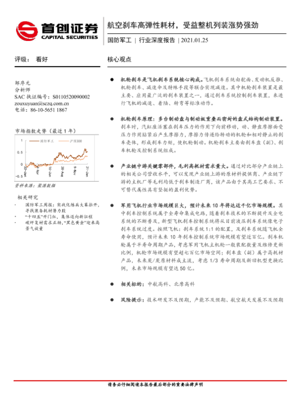 【首创证券】【20210125】20210125-首创证券-国防军工行业深度报告:航空刹车高弹性耗材,受益整机列装涨势强劲-22页 行业研究
