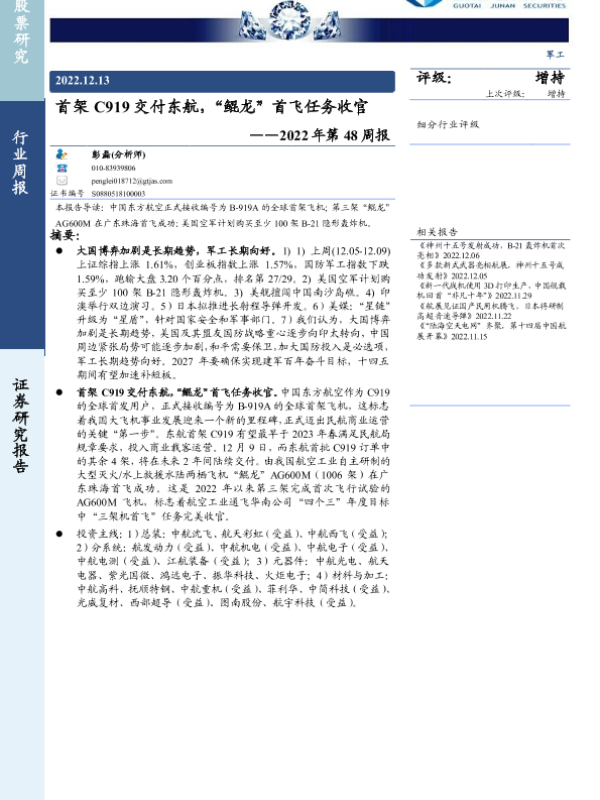 【国泰君安证券】【20221213】2022年第48周报:首架C919交付东航,“鲲龙”首飞任务收官-14页 行业研究