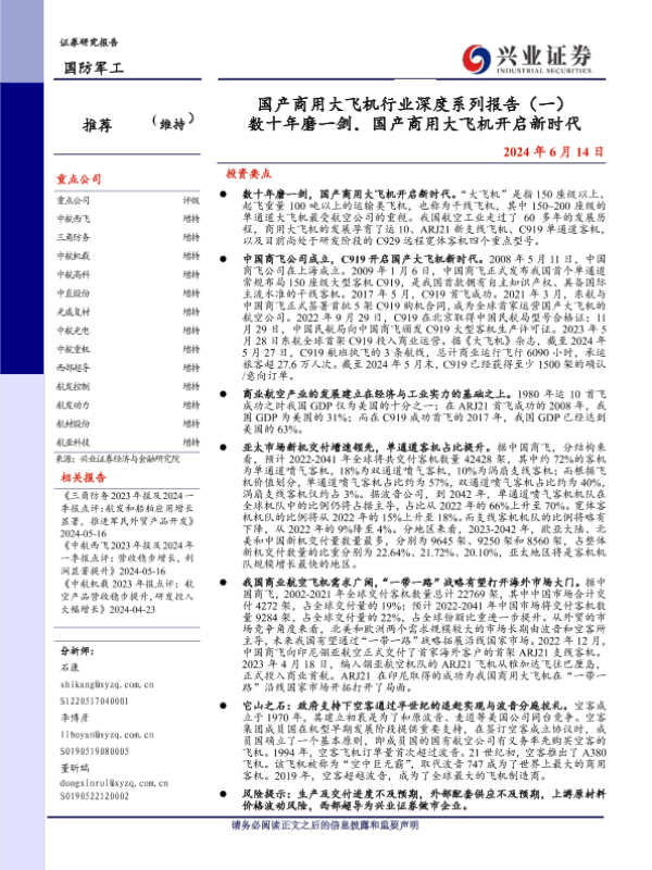 【兴业证券】【20240614】国产商用大飞机行业深度系列报告(一):数十年磨一剑,国产商用大飞机开启新时代-31页 行业研究