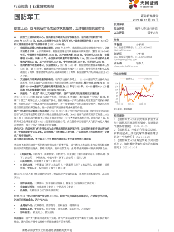 【天风证券】【20211213】航空工业:国内航运市场成全球恢复最快、运作最好的航空市场-3页 行业研究