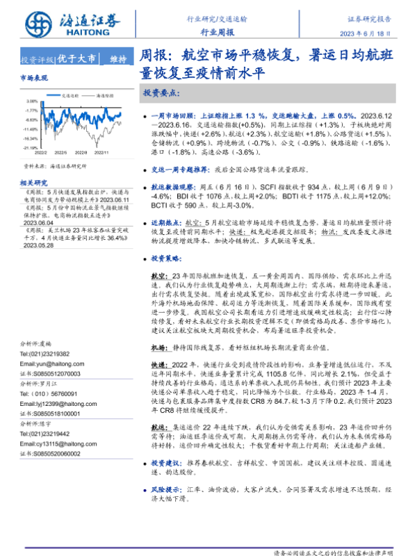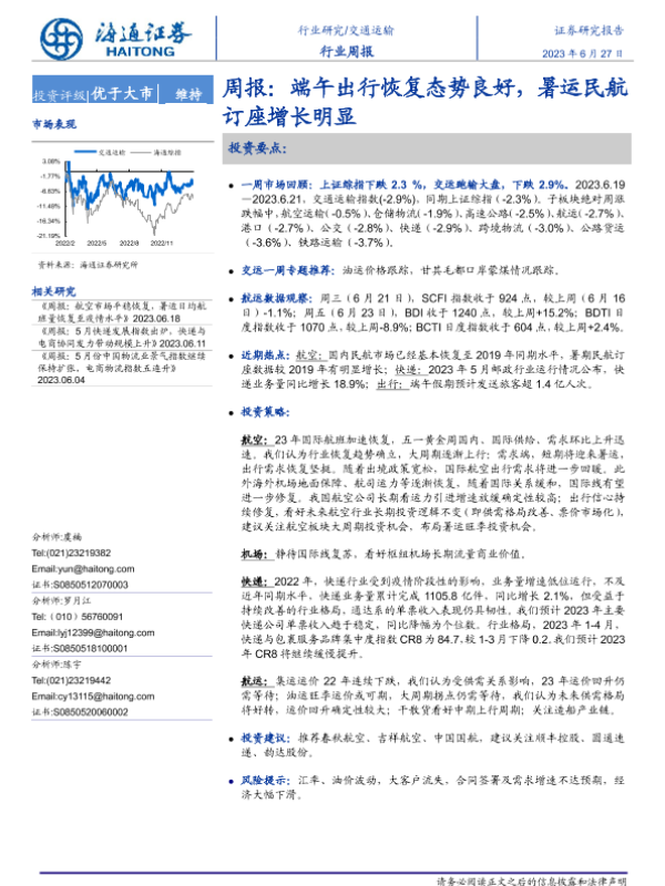 【海通证券】【20230827】交运物流行业周报:国内暑运出行保持旺盛,关注防御性板块机会-18页 行业研究
