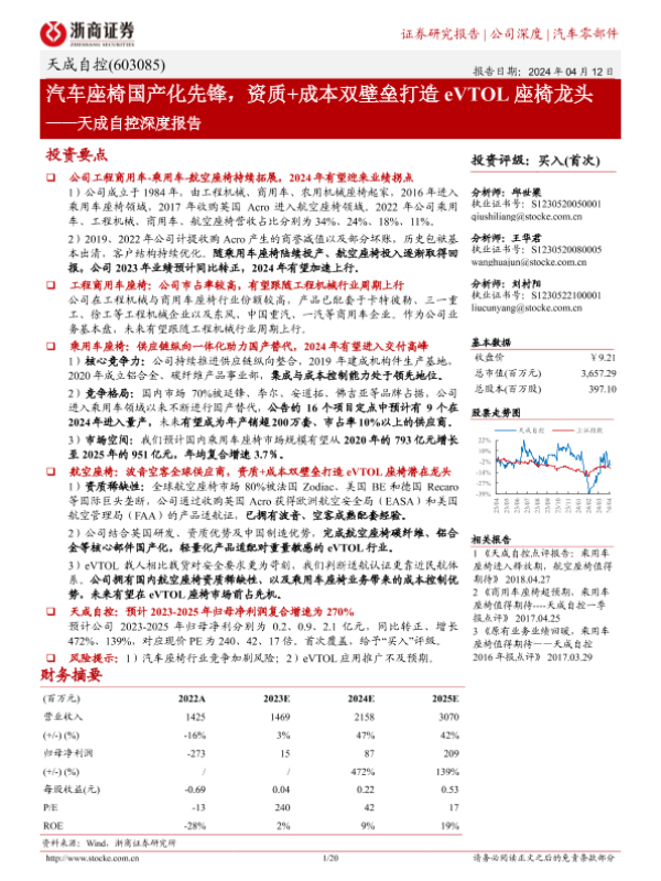 【浙商证券】【20240412】天成自控深度报告:汽车座椅国产化先锋,资质+成本双壁垒打造eVTOL座椅龙头-20页 行业研究