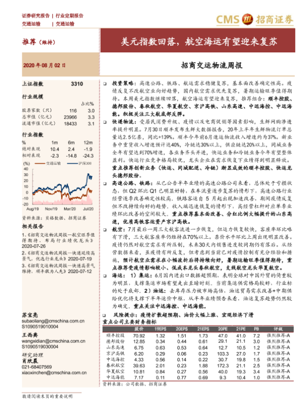 【海通证券】【20200802】招商交运物流周报:美元指数回落,航空海运有望迎来复苏-28页 行业研究