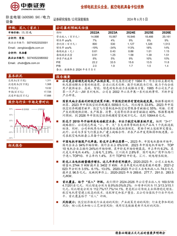 【中泰证券】【20240605】卧龙电驱(600580)全球电机龙头企业,航空电机具备卡位优势-27页 行业研究
