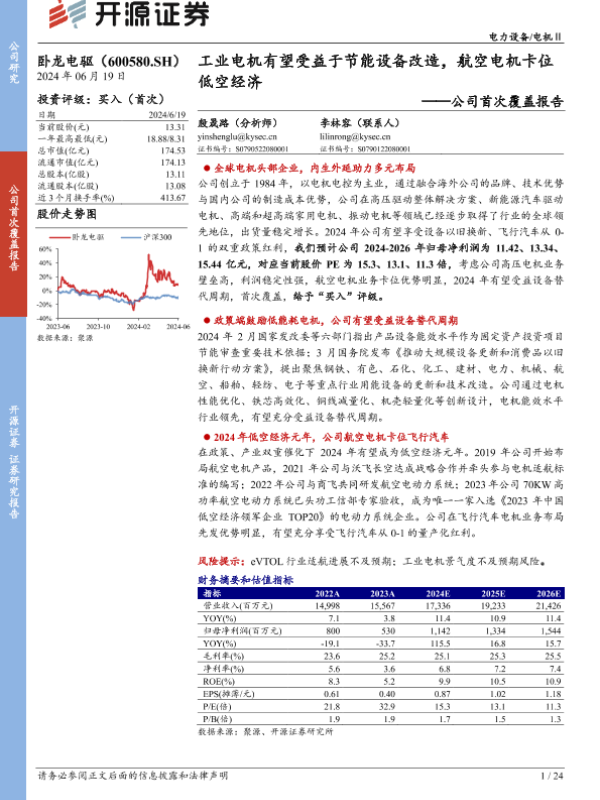 【开源证券】【20240619】卧龙电驱-公司首次覆盖报告:工业电机有望受益于节能设备改造,航空电机卡位低空经济-24页 证券期货研究报告