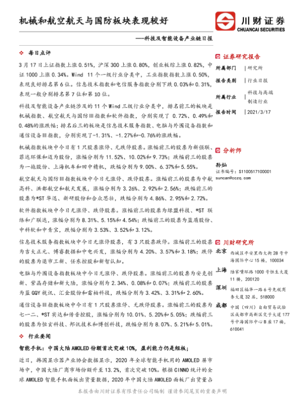 【川财证券】【20210317】科技及智能设备产业链日报:机械和航空航天与国防板块表现较好-3页 证券期货研究报告