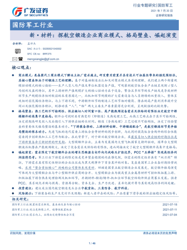 【广发证券】【20210720】新·材料:探航空锻造企业商业模式、格局壁垒、崛起演变-46页 行业研究