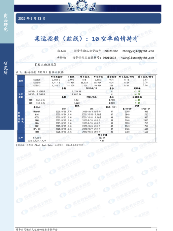 【国泰君安期货】【20250813】集运指数(欧线):10空单酌情持有-4页 证券期货研究报告
