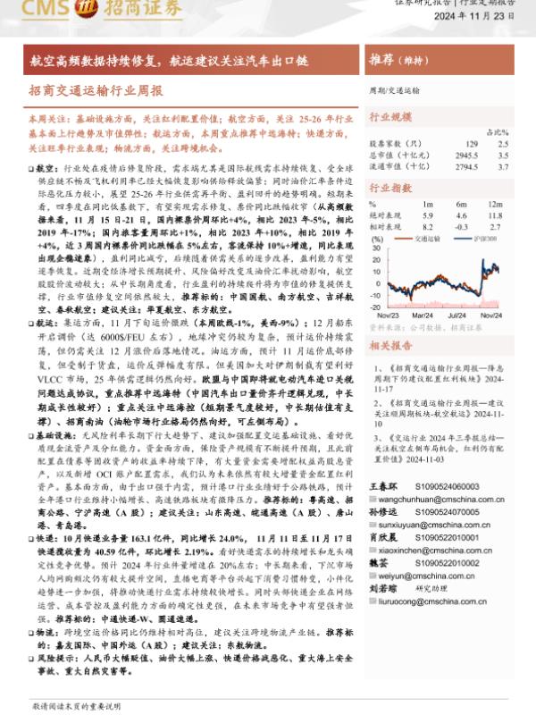 【海通证券】【20241123】招商交通运输行业周报:航空高频数据持续修复,航运建议关注汽车出口链-15页 行业研究