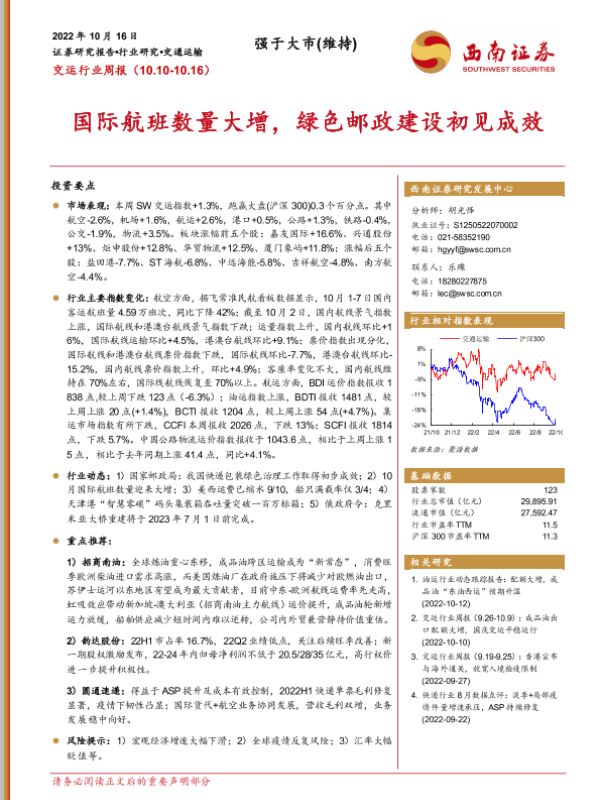 【西南证券】【20221016】交运行业周报:国际航班数量大增,绿色邮政建设初见成效-19页 行业研究