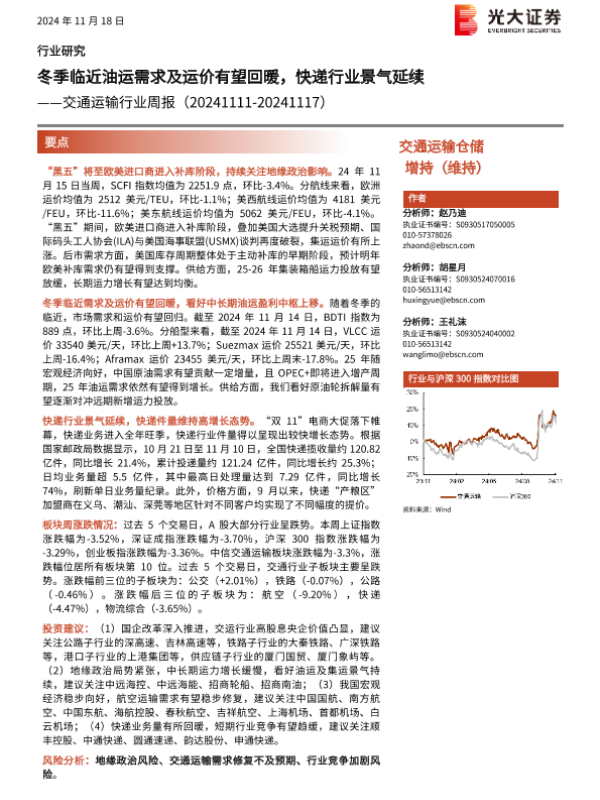 【光大证券】【20241118】交通运输行业周报:冬季临近油运需求及运价有望回暖,快递行业景气延续-15页 行业研究