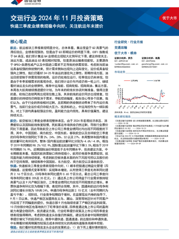 【国信证券】【20241103】交运行业2024年11月投资策略:快递三季度业绩表现稳中向好,关注航运年末提价-23页 行业研究