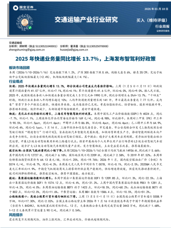 【国金证券】【202601】交通运输产业行业研究:2025年快递业务量同比增长13.7%,上海发布智驾利好政策-17页 证券期货研究报告