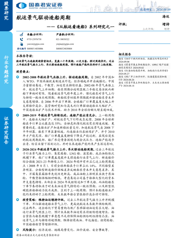 【国泰君安证券】【20240909】海运行业《从航运看造船》系列研究之一:航运景气驱动造船周期-17页 行业研究