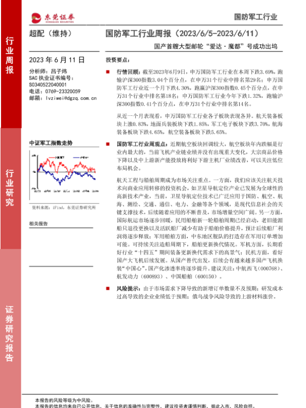 【东莞证券】【20230611】20230611-东莞证券-国防军工行业周报:国产首艘大型邮轮“爱达·魔都”号成功出坞-11页 行业研究
