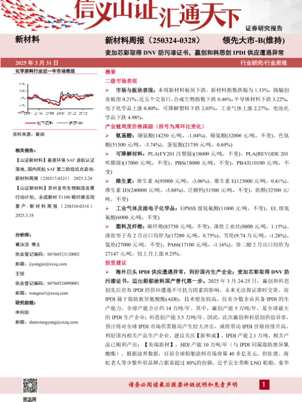 【山西证券】【20250331】新材料周报:麦加芯彩取得DNV防污漆证书,赢创和科思创IPDI供应遭遇异常-23页 行业研究