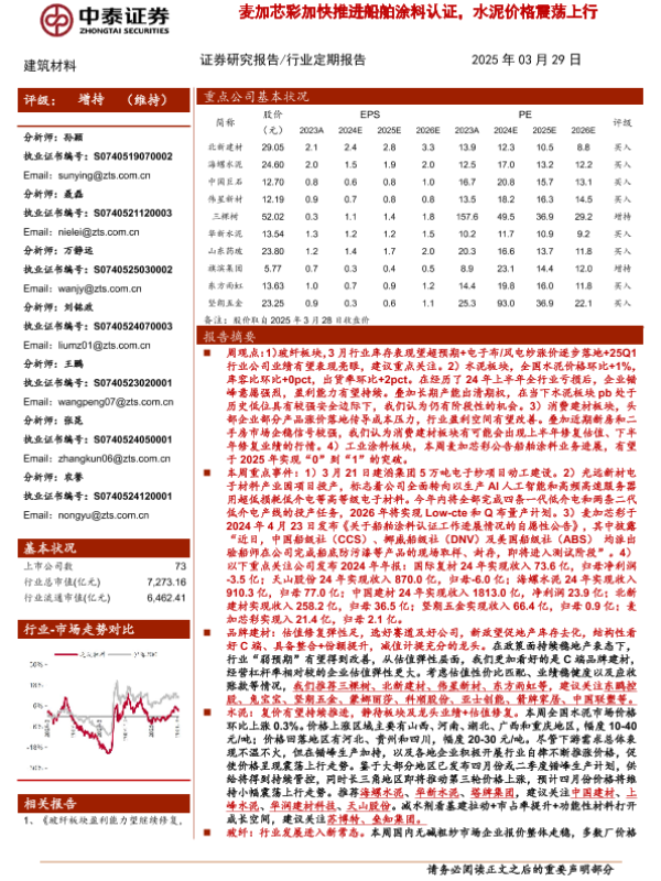 【中泰证券】【20250329】麦加芯彩加快推进船舶涂料认证,水泥价格震荡上行-20页 证券期货研究报告