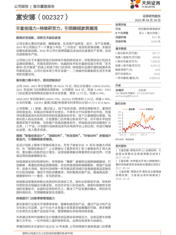 【天风证券】【20230928】富安娜-丰富创造力+持续研发力,引领睡眠家居潮流-21页 行业研究