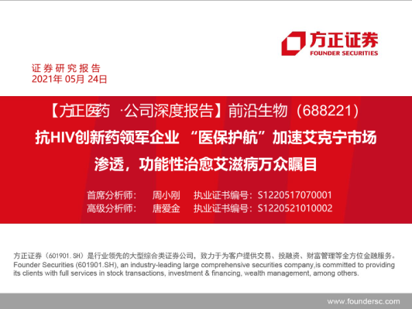 【方正证券】【20210524】前沿生物:抗HIV创新药领军企业,“医保护航”加速艾克宁市场渗透,功能性治愈艾滋病万众瞩目-58页 行业研究