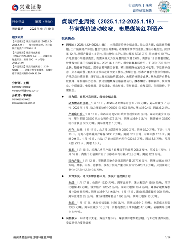 【兴业证券】【20250119】20250119-兴业证券-煤炭行业周报:节前煤价波动收窄,布局煤炭红利资产-14页 行业研究