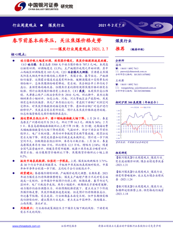 【银河证券】【20210207】中国银河-煤炭行业周度观点:春节前基本面承压,关注焦煤价格走势-14页 行业研究
