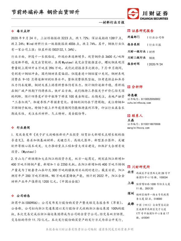 【川财证券】【20200924】材料行业日报:节前终端补库 钢价出货回升-3页 证券期货研究报告