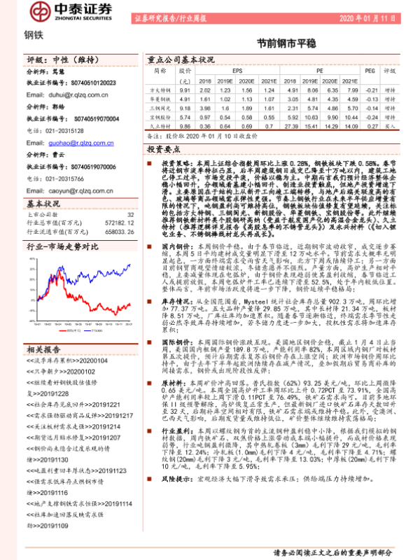 【中泰证券】【20200111】20200111-中泰证券-钢铁行业周报:节前钢市平稳-14页 行业研究