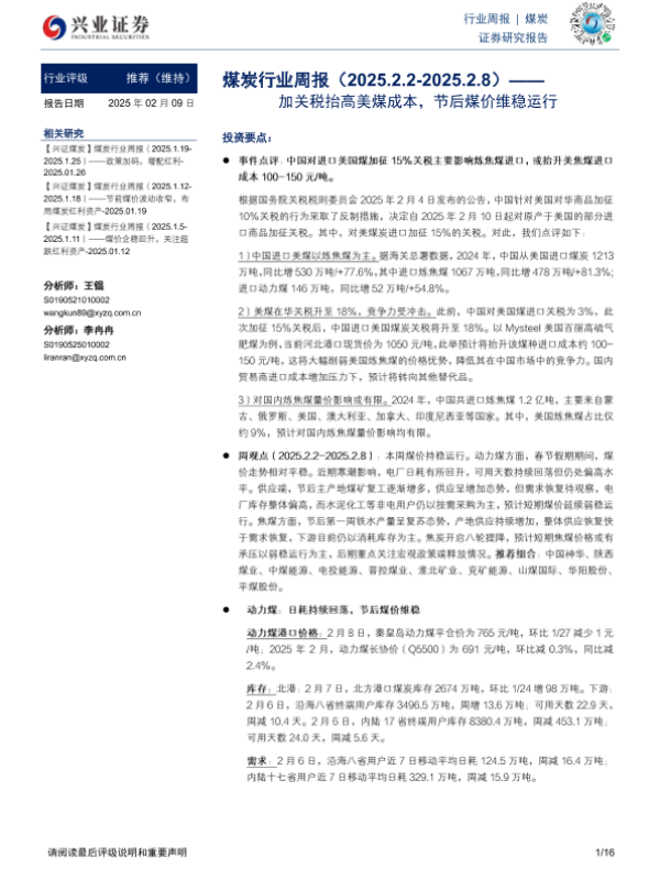 【兴业证券】【20250209】20250211-兴业证券-煤炭行业周报:加关税抬高美煤成本,节后煤价维稳运行-16页 行业研究