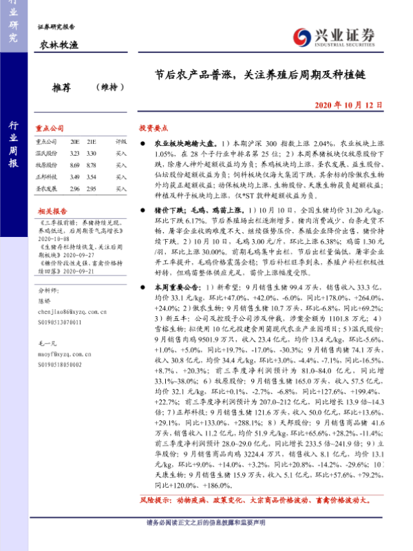 【兴业证券】【20201012】20201012-兴业证券-农林牧渔行业周报:节后农产品普涨,关注养殖后周期及种植链-15页 行业研究