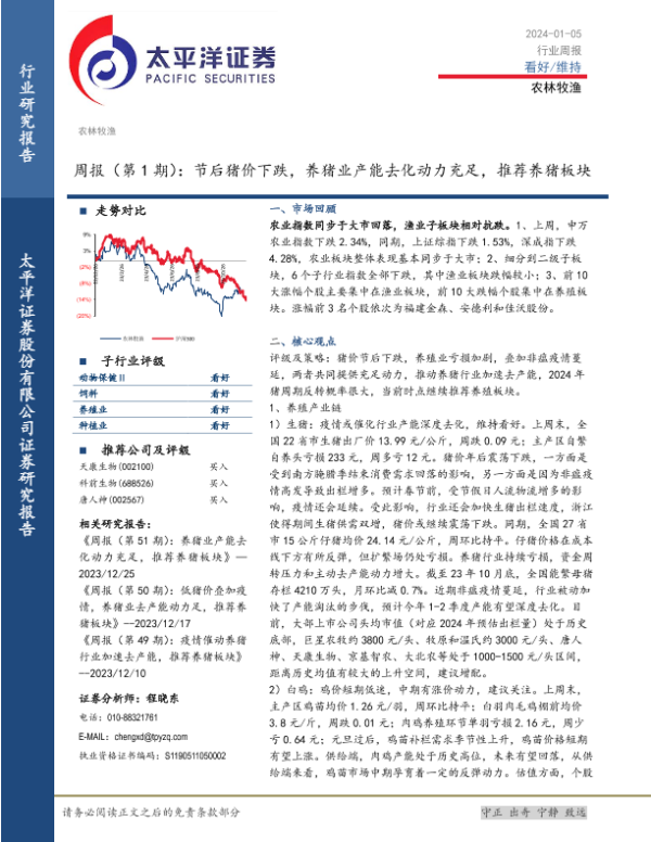 【太平洋证券】【20240105】农林牧渔行业周报(第1期):节后猪价下跌,养猪业产能去化动力充足,推荐养猪板块-17页 行业研究