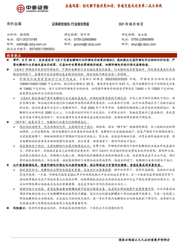 【中泰证券】【20210830】金属观察:铝电解节能政策加持,索通发展或迎来第二成长曲线-5页 行业研究