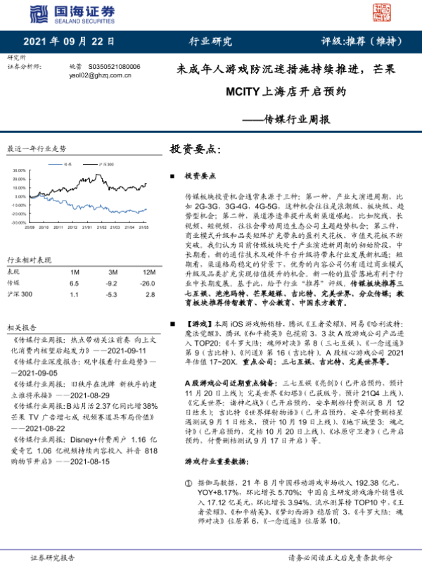 【国海证券】【20210922】20210922-国海证券-传媒行业周报:未成年人游戏防沉迷措施持续推进,芒果MCITY上海店开启预约-32页 行业研究