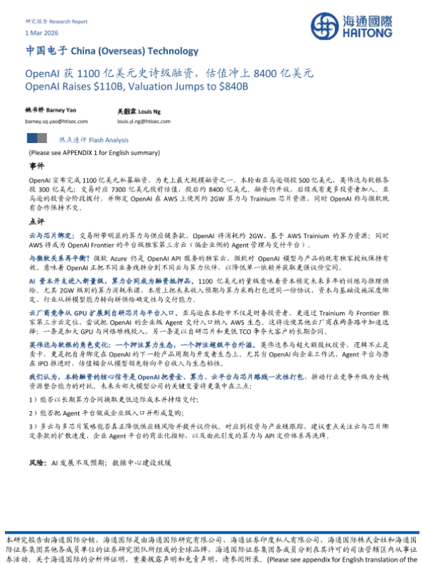 【海通国际】【202603】OpenAI获1100亿美元史诗级融资,估值冲上8400亿美元-9页 证券期货研究报告
