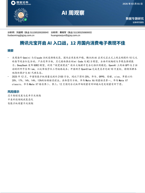 【国金证券】【202502】AI周观察:腾讯元宝开启AI入口战,12月国内消费电子表现不佳-8页 证券期货研究报告