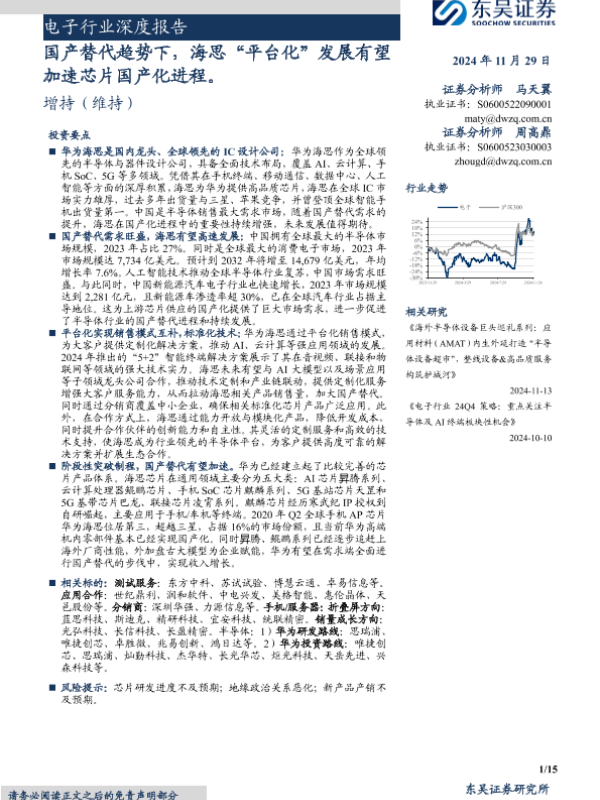 【东吴证券】【20241129】电子行业深度报告:国产替代趋势下,海思“平台化”发展有望加速芯片国产化进程-15页 行业研究
