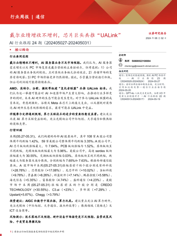 【西部证券】【20240602】AI行业跟踪24期:戴尔业绩增收不增利,芯片巨头共推“UALink”-11页 行业研究