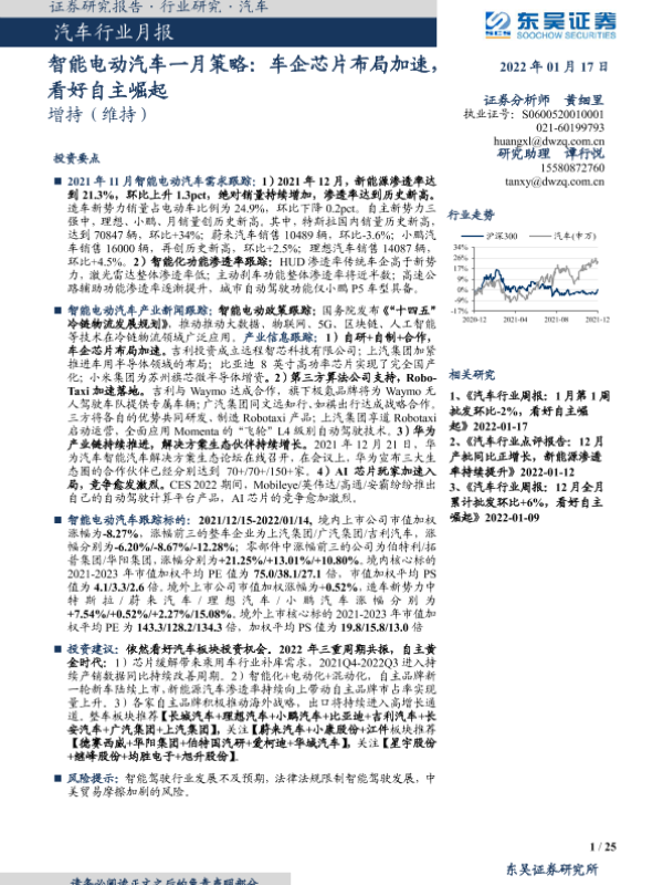 【东吴证券】【20220117】汽车行业智能电动汽车一月策略:车企芯片布局加速,看好自主崛起-25页 行业研究