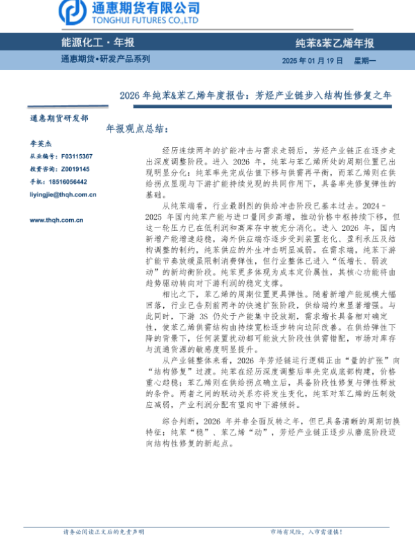 【通惠期货研发部】【202501】2026年纯苯&苯乙烯年度报告:芳烃产业链步入结构性修复之年-22页 证券期货研究报告