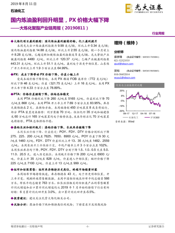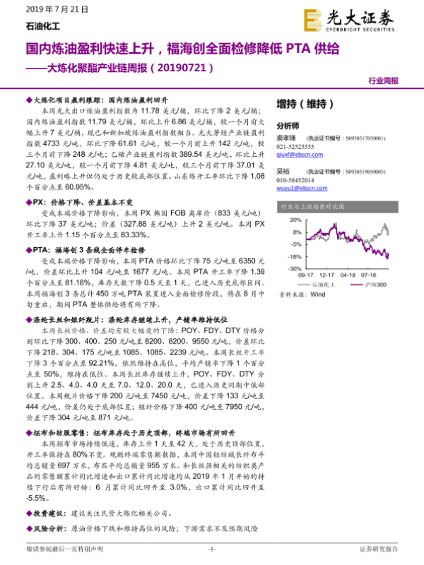 【光大证券】【20190728】大炼化聚酯产业链周报:国内炼油盈利持续回升,PTA价格大幅下降-13页 证券期货研究报告