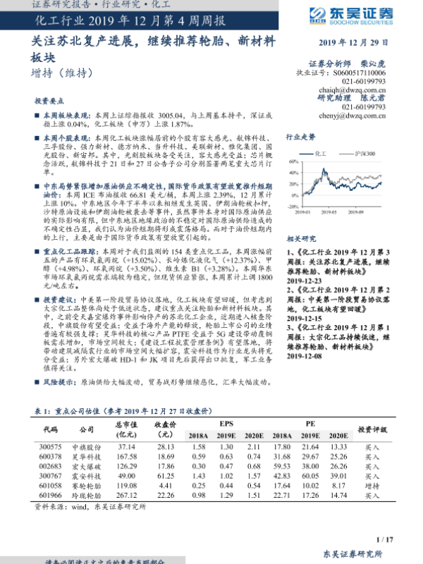 【东吴证券】【20191229】化工行业2019年12月第4周周报:关注苏北复产进展,继续推荐轮胎、新材料板块-17页 行业研究