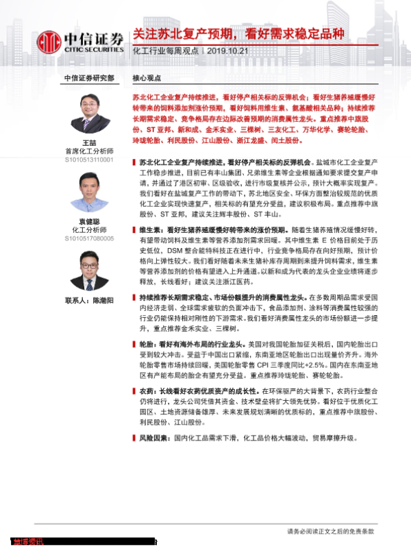 【中信证券】【20191021】20191021-中信证券-化工行业每周观点:关注苏北复产预期,看好需求稳定品种-27页 行业研究