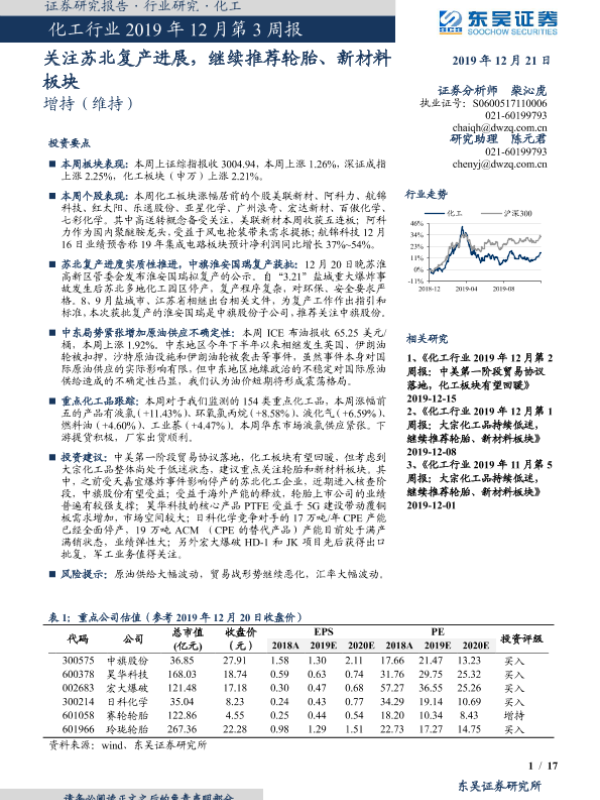 【东吴证券】【20191221】化工行业2019年12月第3周报:关注苏北复产进展,继续推荐轮胎、新材料板块-17页 行业研究